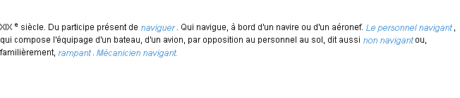 Définition issue du dictionnaire wiktionary pour le mot « navigant ».Merci à Emeline et Gervais pour la numérisation du mot navigant.