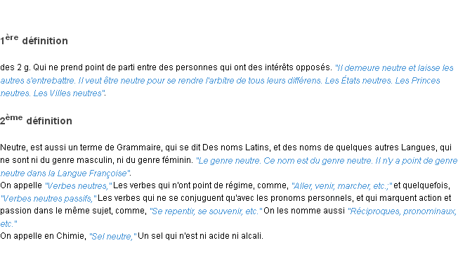 Ancienne signification développée en 1798 par l’académie Française (ACAD - 1798).Merci à Léandre et Laurette pour la numérisation du mot neutre.