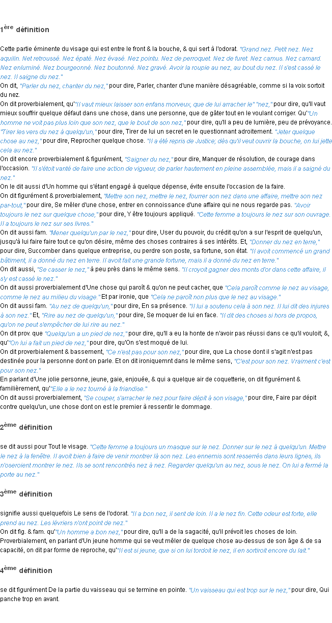 Ancienne signification éditée par l’Académie Française, année 17962.Merci à Paulette et Theirn pour la numérisation du mot nez.