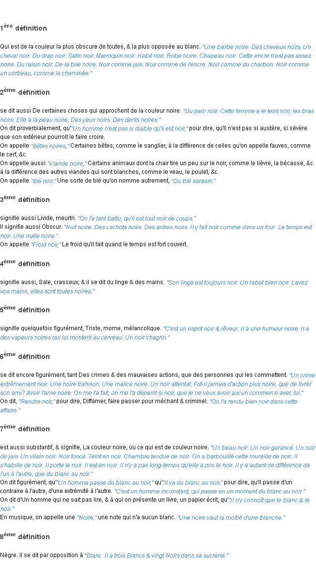 Ancienne définition académique pour le terme « noir » (parue en 17962).Merci à Léandre et Stéphane pour la numérisation du mot noir.