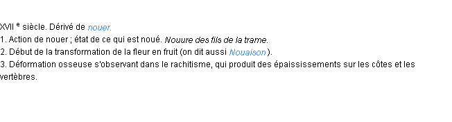 Signification développée en 1876 par Mr Littré (dictionnaire dit d’Emile Littré).Merci à Edmond et Sylvestre pour la numérisation du mot nouure.