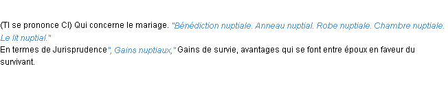 Ancienne signification éditée par l’Académie Française, année 1798.Merci à Amélie et Paule pour la numérisation du mot nuptial.