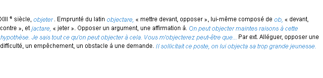Ancienne définition du mot « objecter » par l’Académie Française (édition de 1798).Merci à Charlot et Gisèle pour la numérisation du mot objecter.