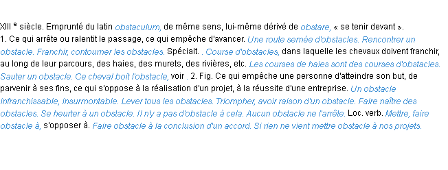Définition « obstacle » du dictionnaire académique Français, parution de l’année 1986.