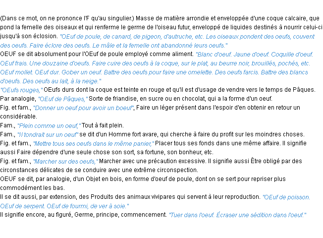 Ancienne définition de l’Académie Française (édition de 1835) pour le mot « oeuf ».