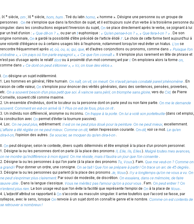 Définition « on » du dictionnaire académique Français, parution de l’année 1986.