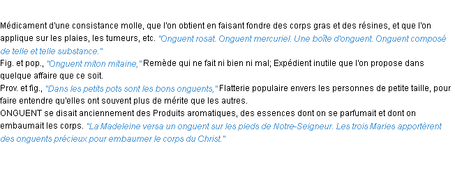Ancienne signification parue en 1798 dans dictionnaire de l’Académie Française.Merci à Papillion et édouard pour la numérisation du mot onguent.