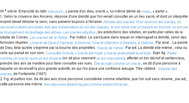 Ancienne signification développée en 1798 par l’académie Française (ACAD - 1798).Merci à Hugues et Théodore pour la numérisation du mot oracle.