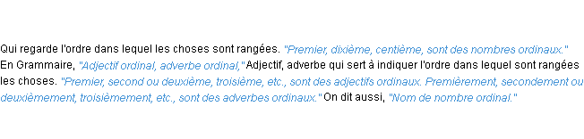 Ancienne signification éditée par l’Académie Française, année 1798.Merci à Jeanne et Corinne pour la numérisation du mot ordinal.
