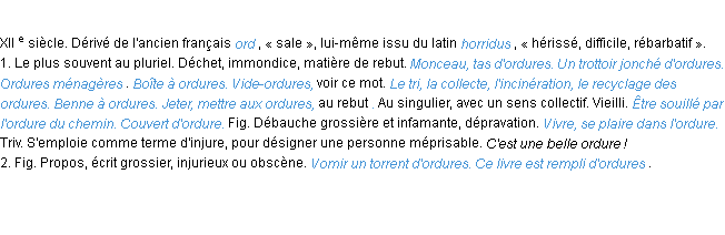 Ancienne signification éditée en 1798 pour le terme « ordure » par l’Académie Française.Merci à Rémy et Arnaud pour la numérisation du mot ordure.