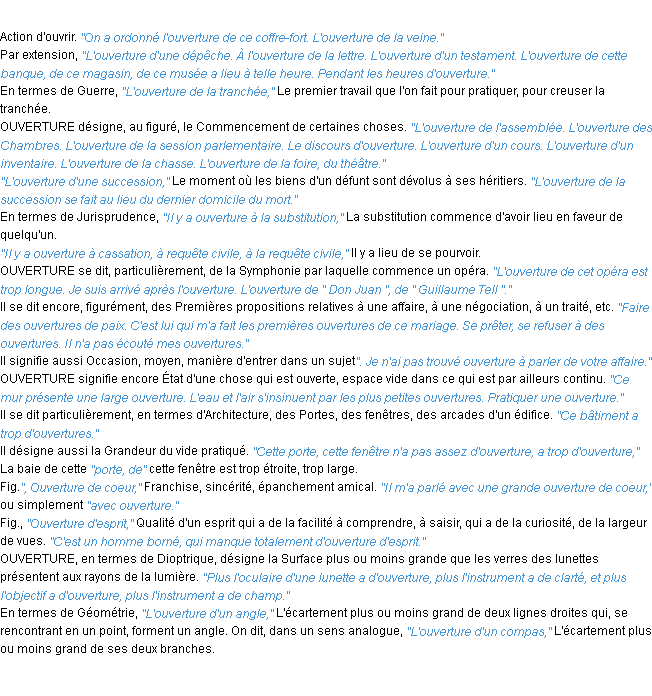 Ancienne signification développée en 1798 par l’académie Française (ACAD - 1798).Merci à Nicolette et Gwenaelle pour la numérisation du mot ouverture.