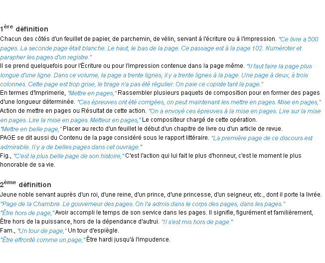 Ancienne signification éditée en 1835 pour le terme « page » par l’Académie Française.