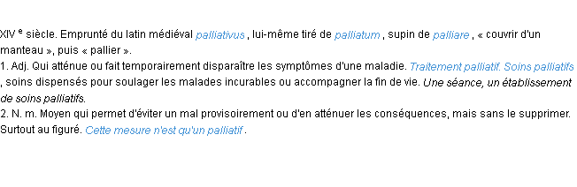 Signification du terme « palliatif », parution de 1986, dictionnaire académique Français.