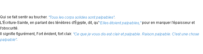 Ancienne signification développée en 1798 par l’académie Française (ACAD - 1798).Merci à Nicolette et Doriane pour la numérisation du mot palpable.