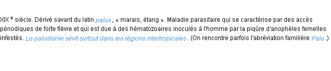 Signification éditée en 2010 par l’équipe de la-definition.fr.Merci à Célestin et Baptiste pour la numérisation du mot paludisme.