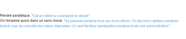 Ancienne signification développée en 1798 par l’académie Française (ACAD - 1798).Merci à Philippe et Sébastien pour la numérisation du mot paralyser.