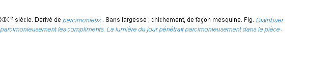 Signification éditée en 1876 pour le terme « parcimonieusement » par Emile Littré.Merci à Fernande et Fabienne pour la numérisation du mot parcimonieusement.