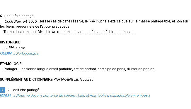 Signification éditée en 1876 pour le terme « partageable » par Emile Littré.