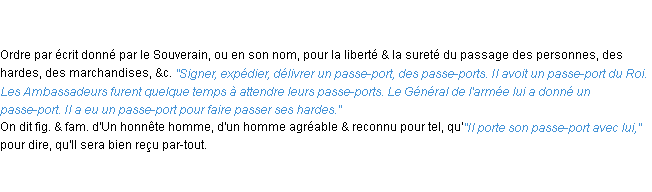 Ancienne définition de « passe-port » de source académique (Académie Française, parution de 1694).Merci à Honorine et Benjamine pour la numérisation du mot passe-port.
