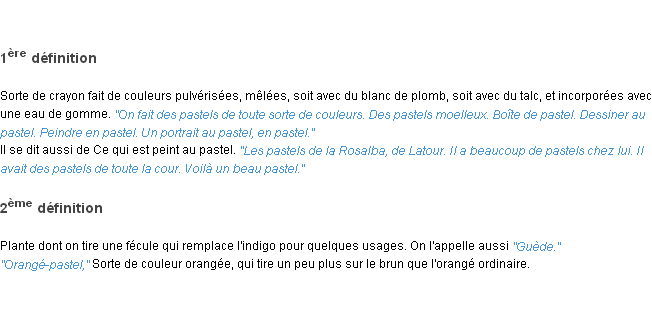 Ancienne signification développée en 1798 par l’académie Française (ACAD - 1798).Merci à Lydie et Luce pour la numérisation du mot pastel.