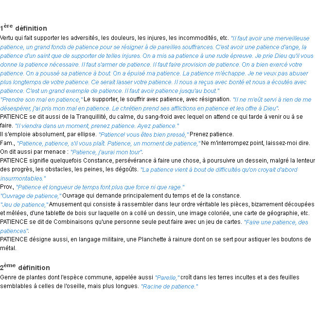 Signification du terme « patience », parution de 1932, dictionnaire académique Français.