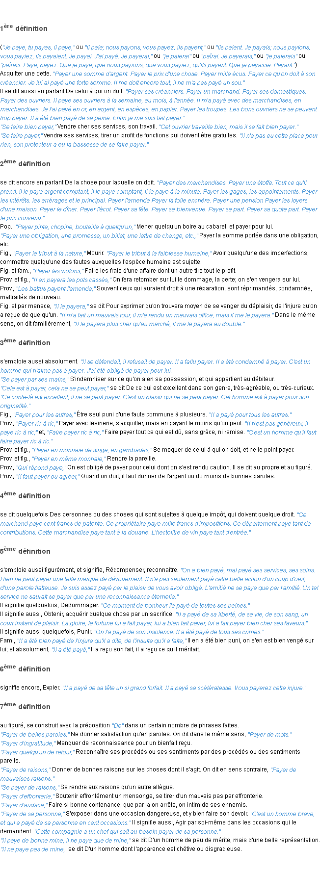 Ancienne signification éditée en 17962 pour le terme « payer » par l’Académie Française.Merci à Mathilde et Cosette pour la numérisation du mot payer.