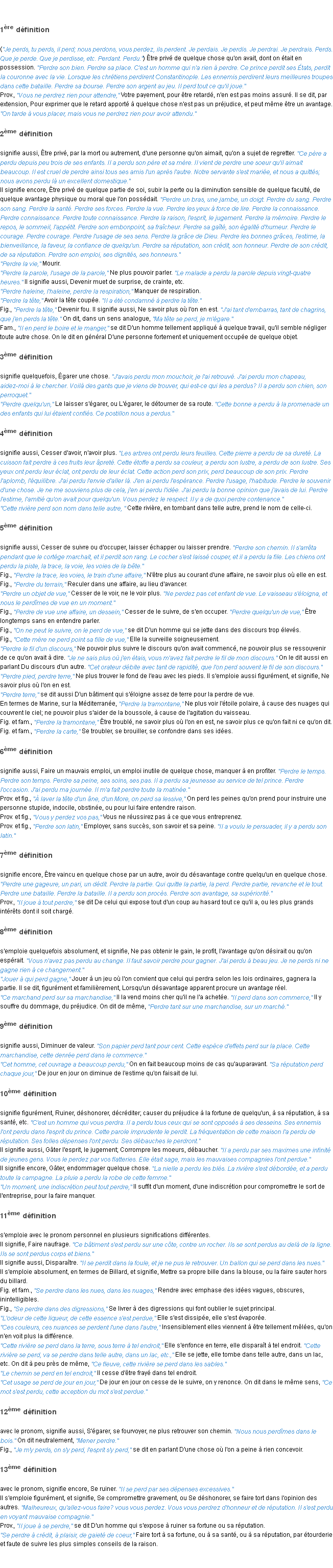 Ancienne définition de l’Académie Française (édition de 17962) pour le mot « perdre ».Merci à Firmin et Philibert pour la numérisation du mot perdre.