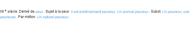 Ancienne signification parue en 1798 dans dictionnaire de l’Académie Française.Merci à Yves et Gilles pour la numérisation du mot peureux.