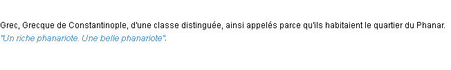Définition développée dans dictionnaire académique, 1932.Merci à Aimée et Bernadette pour la numérisation du mot phanariote.