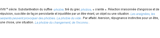 Définition « phobie » du dictionnaire académique Français, parution de l’année 1932.Merci à Baudouin et Jacques pour la numérisation du mot phobie.