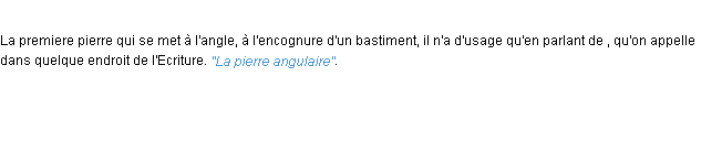 Ancienne signification du terme « pierre angulaire », parution de 1694, dictionnaire académique Français.Merci à Mélanie et Solange pour la numérisation du mot pierre angulaire.