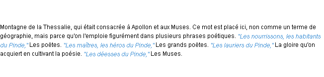 Définition développée dans dictionnaire d’Emile Littré (ancienne édition de 1876).Merci à Françoise et Mariette pour la numérisation du mot pinde.