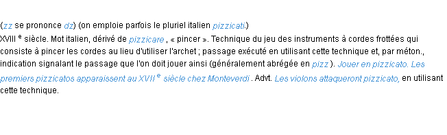 Signification développée en 1876 par Mr Littré (dictionnaire dit d’Emile Littré).Merci à Clementine et Danièle pour la numérisation du mot pizzicato.