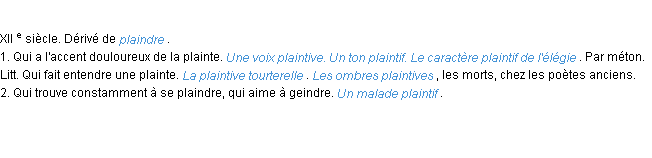 Définition académique pour le terme « plaintif » (parue en 1986).