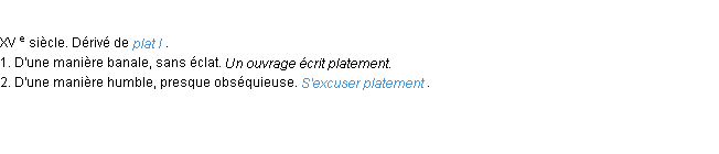 Ancienne signification issue du dico de l’Académie Française, parue en 1798.Merci à Jolie et Florentin pour la numérisation du mot platement.