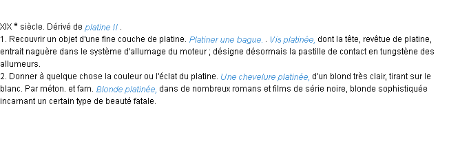 Définition de « platiner » issue du Littré (Auteur Emile Littré, édité en 1876).Merci à Valérie et Emmanuelle pour la numérisation du mot platiner.