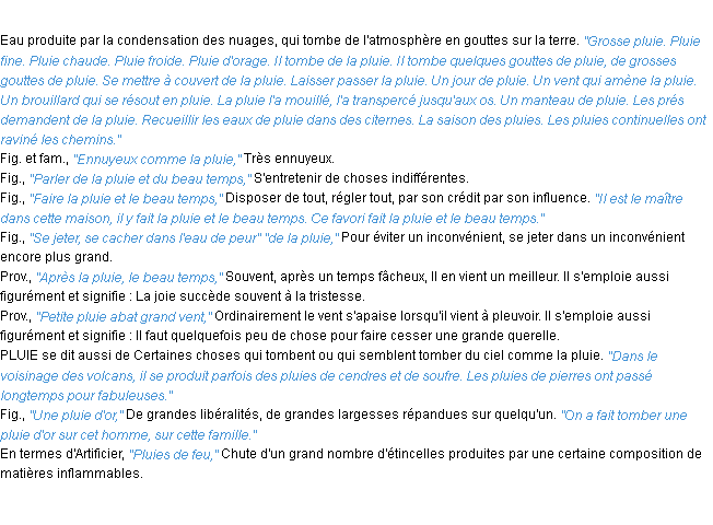 Ancienne signification développée en 1798 par l’académie Française (ACAD - 1798).Merci à Luc et Lucie pour la numérisation du mot pluie.