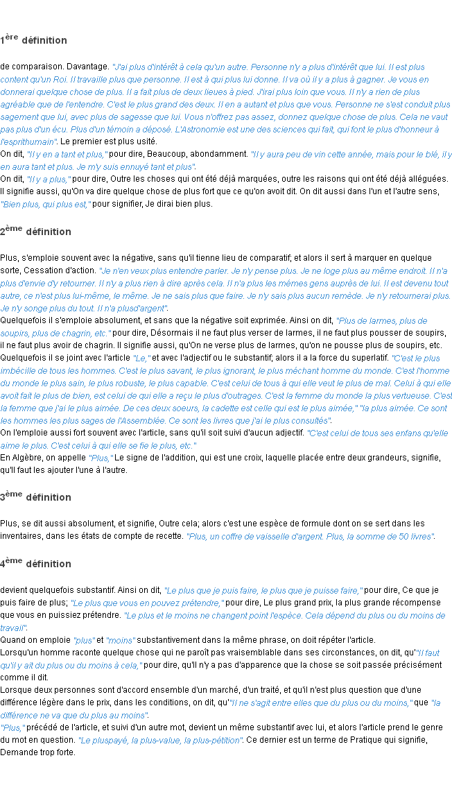 Signification du terme « plus », parution de 1788 (dictionnaire de Mr Féraud).Merci à Solange et Gisèle pour la numérisation du mot plus.