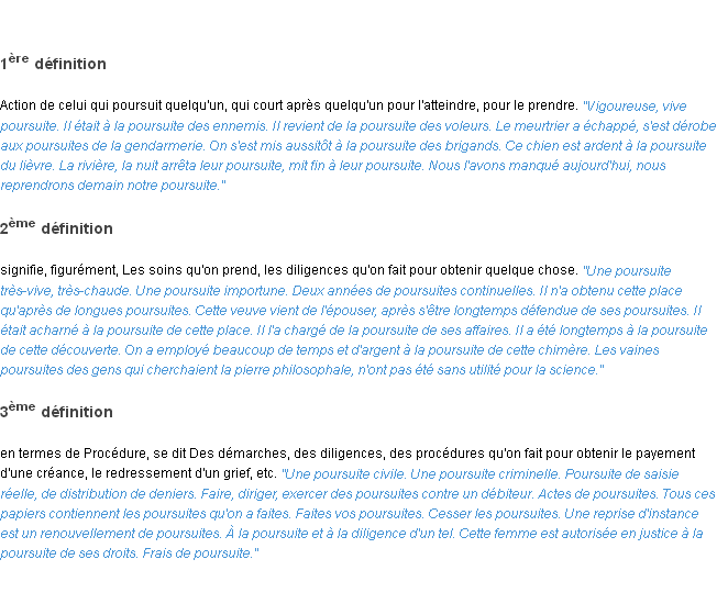 Ancienne signification parue en 1798 dans dictionnaire de l’Académie Française.Merci à Eloi et Clementine pour la numérisation du mot poursuite.
