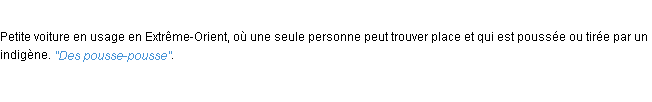 Signification parue en 1932 dans dictionnaire de l’Académie Française.Merci à Yolande et Josèphe pour la numérisation du mot pousse-pousse.