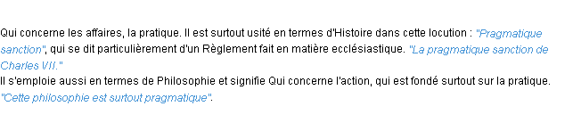 Définition de l’équipe de la-definition.fr (édition de 2009) pour le mot « pragmatique ».Merci à éloise et Mignon pour la numérisation du mot pragmatique.