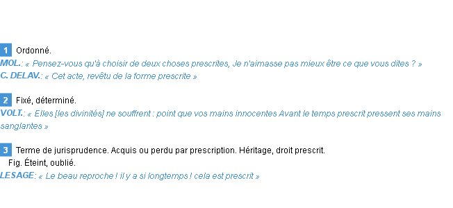Définition du mot « prescrit » par Emile Littré (édition de 1876).Merci à Marie et Christelle pour la numérisation du mot prescrit.