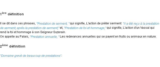 Signification parue en 2009 (source la-definition.fr).Merci à Germaine et Désirée pour la numérisation du mot prestation.