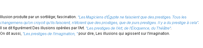 Définition du mot « prestige » par l’équipe de la-definition.fr (édition de 2011).Merci à Corin et Sylvie pour la numérisation du mot prestige.