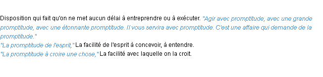 Définition de l’équipe de la-definition.fr (édition de 2009) pour le mot « promptitude ».Merci à Corin et Yves pour la numérisation du mot promptitude.