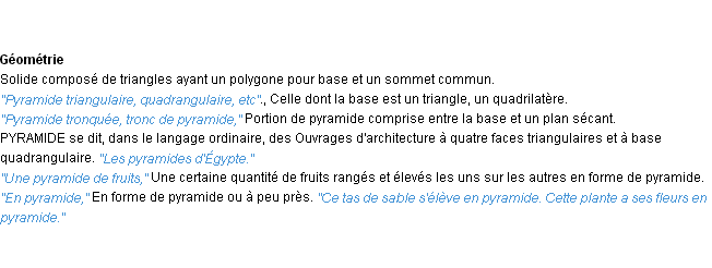 Définition du mot « pyramide » par l’équipe de la-definition.fr (édition de 2011).Merci à Héloïse et Papillion pour la numérisation du mot pyramide.