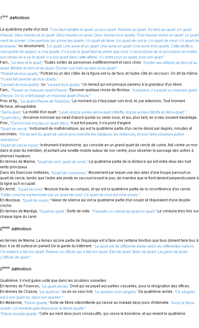 Signification éditée en 2010 par l’équipe de la-definition.fr.Merci à Gervais et Doriane pour la numérisation du mot quart.