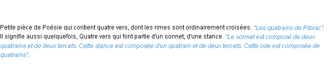 Signification développée en 1876 par Mr Littré (dictionnaire dit d’Emile Littré).Merci à édith et Evrard pour la numérisation du mot quatrain.