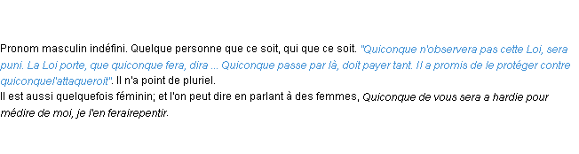 Définition du mot « quiconque » par l’équipe de la-definition.fr (édition de 2011).Merci à Dorothée et Adrien pour la numérisation du mot quiconque.