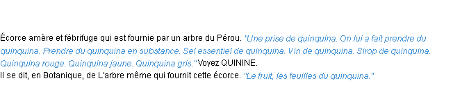 Signification éditée en 2010 par l’équipe de la-definition.fr.Merci à Telesphore et Marine pour la numérisation du mot quinquina.